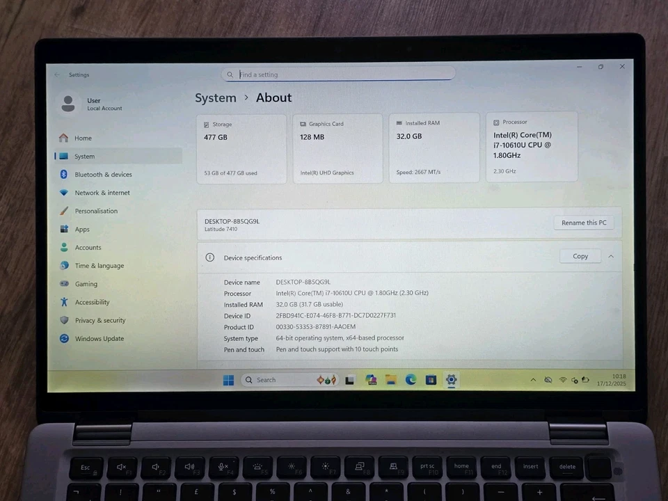 Condition Used: The item has been previously used but is in a perfect condition Processor Intel Core i7 10th Gen. Screen Size 14 in Graphics Processing Type Integrated/On-Board Graphics RAM Size 32 GB MPN 7410 SSD Capacity 512 GB Most Suitable For Casual Computing, Gaming, Graphic Design GPU Intel UHD Graphics Processor Speed 1.10 GHz Colour Silver Brand Dell Series Latitude Type Notebook/Laptop Maximum Resolution 1920 x 1080 Model Dell Latitude 7410 Connectivity HDMI, Micro-USB, USB 2.0, USB 3.1, USB-C Operating System Windows 11 Pro Features Backlit Keyboard, Bluetooth, Built-in Microphone, Built-in Webcam, Multi-Touch Trackpad, Touch ID, Touchscreen, Widescreen Display, Wi-Fi Hard Drive Capacity -- Storage Type SSD (Solid State Drive) Item Weight 1.2 kg Country of Origin China